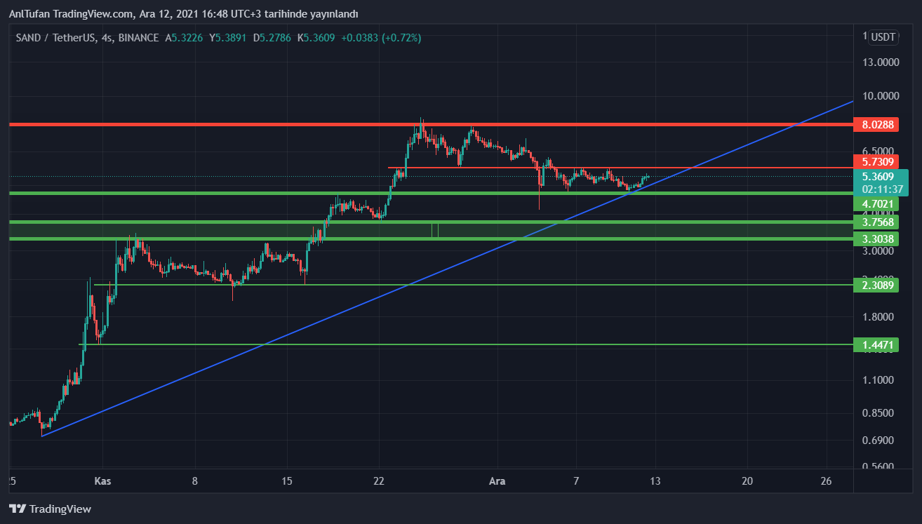 Bir çok kripto para gibi yükselen trendini kırıp 4.70 dolar desteğine gerilemesi durumunda, SAND güzel alım fırsatları verebilir. 4.70 dolar desteğinin altına sarkması beklenmeyen SAND, market crash olmaması halinde yükselişine devam edecek gibi duruyor.