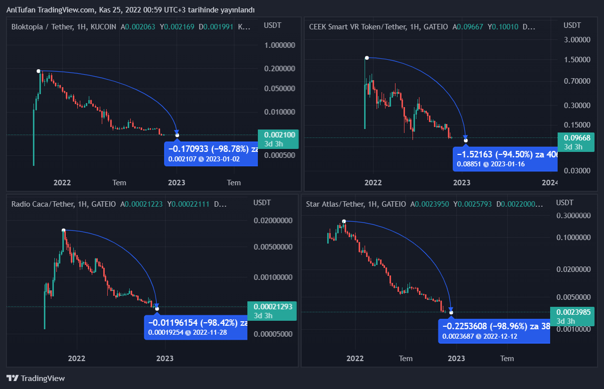 Bu metaverse altcoin’leri her ne kadar devasa oranda yükseliş yaşayarak yatırımcılarını milyoner etmiş olsa da, zirve seviyeden yüzde 95-99 aralığında bir düşüş yaşamış durumdalar.