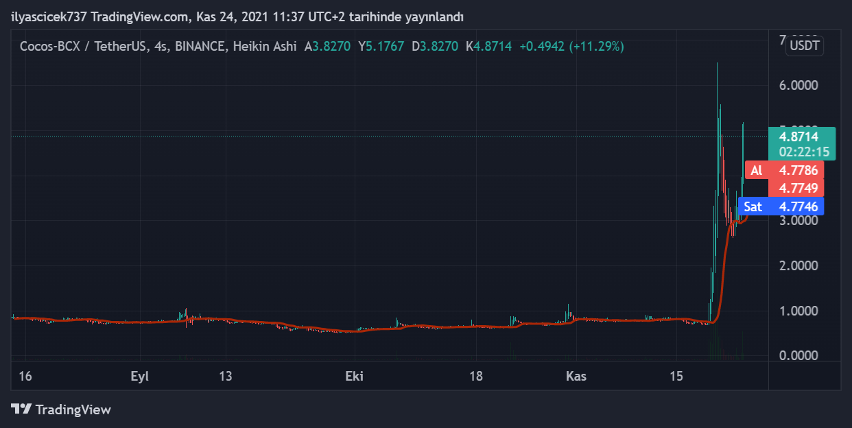 2.70 dolar civarına kadar büyük bir düzeltme yaptığı görülen COCOS, tekrar bir yükseliş trendi başlattığı görülmekte. Son 1 gün içerisinde %40 üzerinde artış ile 4.70 dolar civarında işlem görüyor.