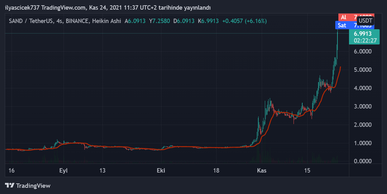 Sandbox, yayın saati ile 24 saatlik dilimde %27 artış ile 6.82 dolar civarında işlem görüyor. SAND, gün kapanışından önce 5 dolar seviyesinde yer alırken, gün ortasına doğru 7 dolar civarını aşmış durumda.