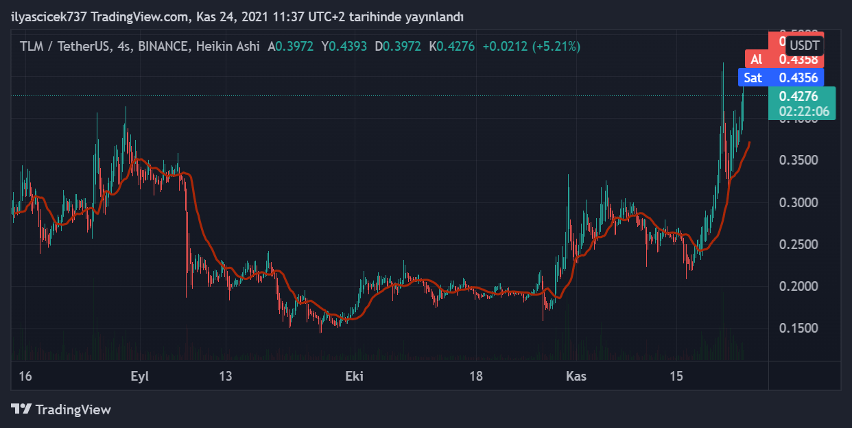 Dünyada aktif olarak en fazla çevrim içi kullanıcısı bulunan NFT video oyun platformu TLM, 24 saat içerisinde %17 artış ile 0.43 dolar seviyesinde işlem görmekte.