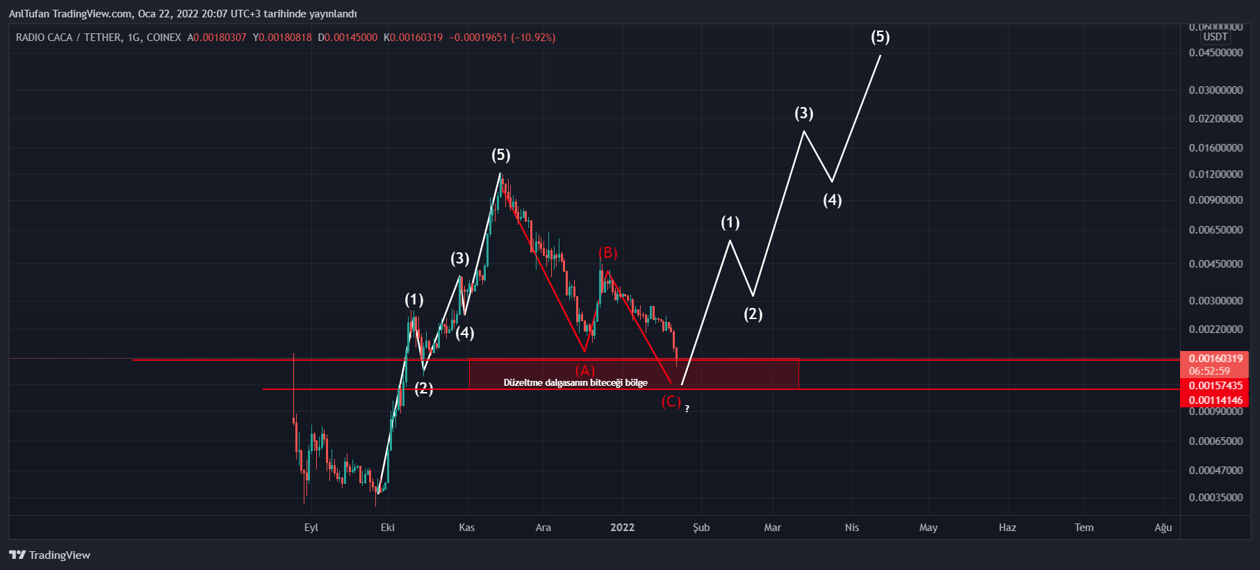 Elliot’un itki dalgaları teorimine göre 5 dalga halinde yükselişini yaşamış olan RACA, normal sayılacak a, b, c paternleriyle 0.0011 – 0.0015 dolar alanına düşüş yaşadı. C dalgasının nerede tamamlanacağı bilinmese de bu bölge içinde tamamlanması bekleniyor.