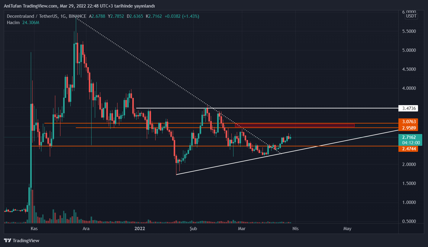 İlerleyen günlerde 2.95 – 3.00 dolar direncine kadar yükselmesi beklenen MANA, bu direnç seviyesini hacimli bir şekilde kırması durumunda ise 3.47 dolar seviyesine kadar yükselmesi beklenebilir.