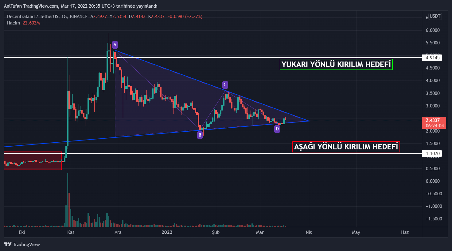 Yayın saati itibariyle 2.43 dolar seviyelerinde bulunan MANA, bir simetrik üçgen oluşturmuş durumda.