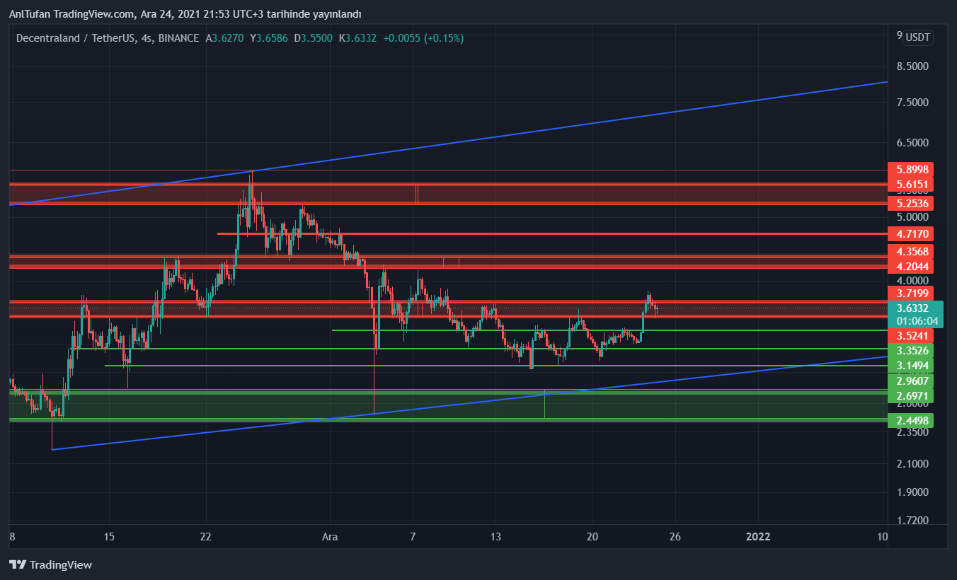 CoinMarketCap verilerine göre 6.5 milyar dolar piyasa değeri bulunan MANA, 28. sırada yer alıyor. Yayın saati itibariyle 3.61 dolar seviyelerinden fiyatlanan MANA, 3.70 – 3.52 dolar direnç seviyesini desteğe çevirmiş gibi gözüküyor.