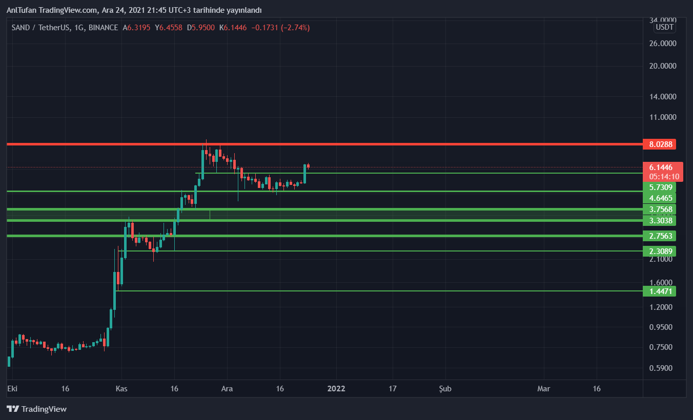8.02 dolar seviyelerinde sert bir direnci bulunan SAND’ın bu seviye üzerinde kalması haline yeni ATH seviyelerine doğru yükselmesi bekleniyor. 10 dolar psikolojik direncini kırması durumunda, daha yüksek seviyeleri hedefleyebilir.