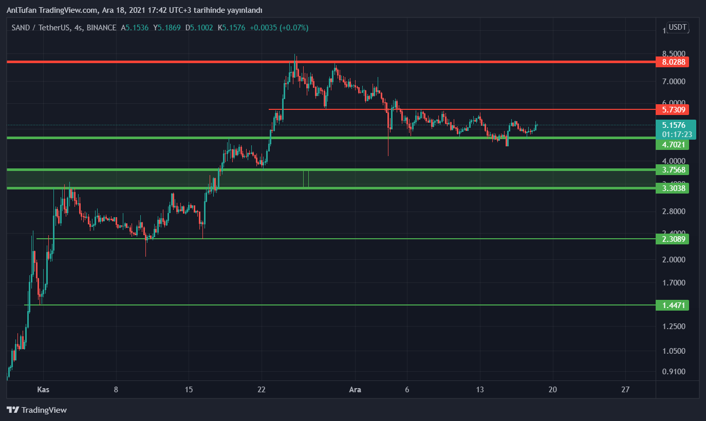 4 Aralık tarihinden bu yana 4.70 dolar destek seviyesi ile 5.70 dolar direnç seviyesi arasında akümüle olan SAND, halen bir yön tayin etmemiş gibi gözükmekte. Kırılım hangi yöne gelirse gelsin sert hareketler yapabilecek SAND’ın, ilerleyen günlerde yükselmesi daha olası duruyor.
