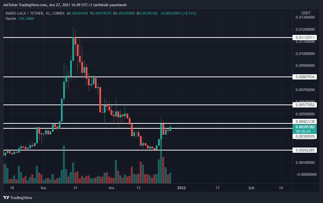Yayın saati itibariyle 0.003940 dolar seviyelerinde bulunan RACA, 0.004230 – 0.003830 dolar direnç seviyesini kırmaya çalışıyor. Bu direnç seviyesi üzerinde kaldığı sürece üst direnç seviyelerini hedeflemesi beklenmekte.