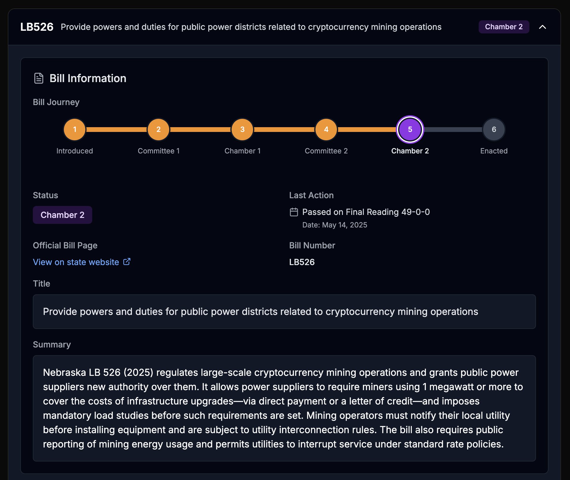 Kısa süre önce gelen bilgilere göre ise Nebraska Eyalet Meclisi, büyük ölçekli kripto madencilik operasyonlarını düzenleyen LB 526 (2025) numaralı yasa tasarısını kabul etti.