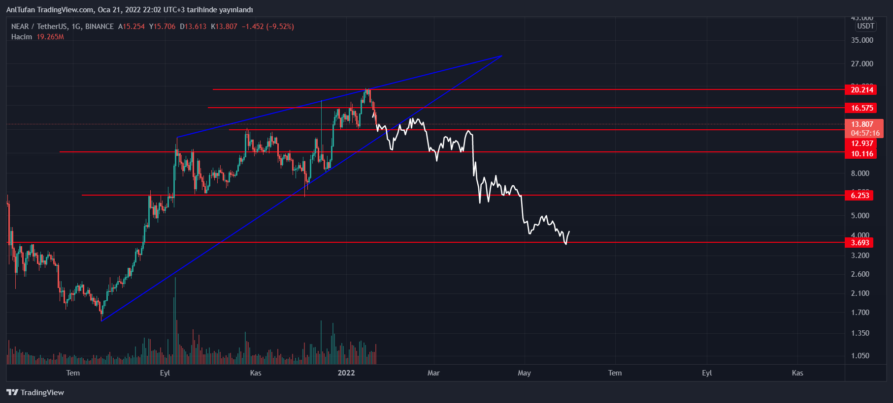 Formasyonun alt bandından destek alamayıp kırılım yapması halinde kademeli bir şekilde düşüşler yaşayabilecek olan NEAR, 2021 yılının başlarında başladığı rallinin sonuna gelmiş olabilir.