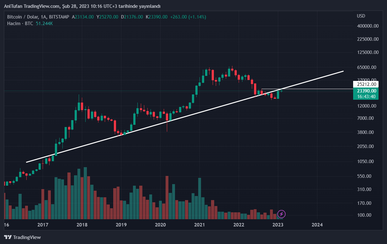 Son yükseliş hareketlerini detaylıca incelediğimizde bu hamlelerin bir retest hareketi olabileceği görülüyor. Bitcoin’in bu trendin ve 25.200 doların üzerinde bir aylık kapanış yapmaması, her zaman çöküş tehlikesini ortaya çıkarmakta.