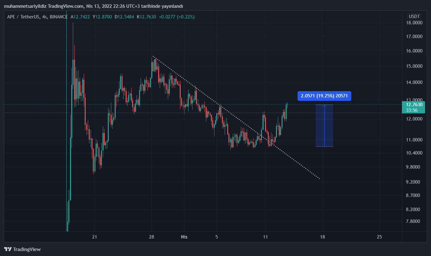 İlerleyen günlerde 13 dolar direncinin kırılmasıyla değer kazanmaya devam edebilecek olan ApeCoin, 12.40 doları kaybetmesi durumunda ise düşüş yaşayabilir.