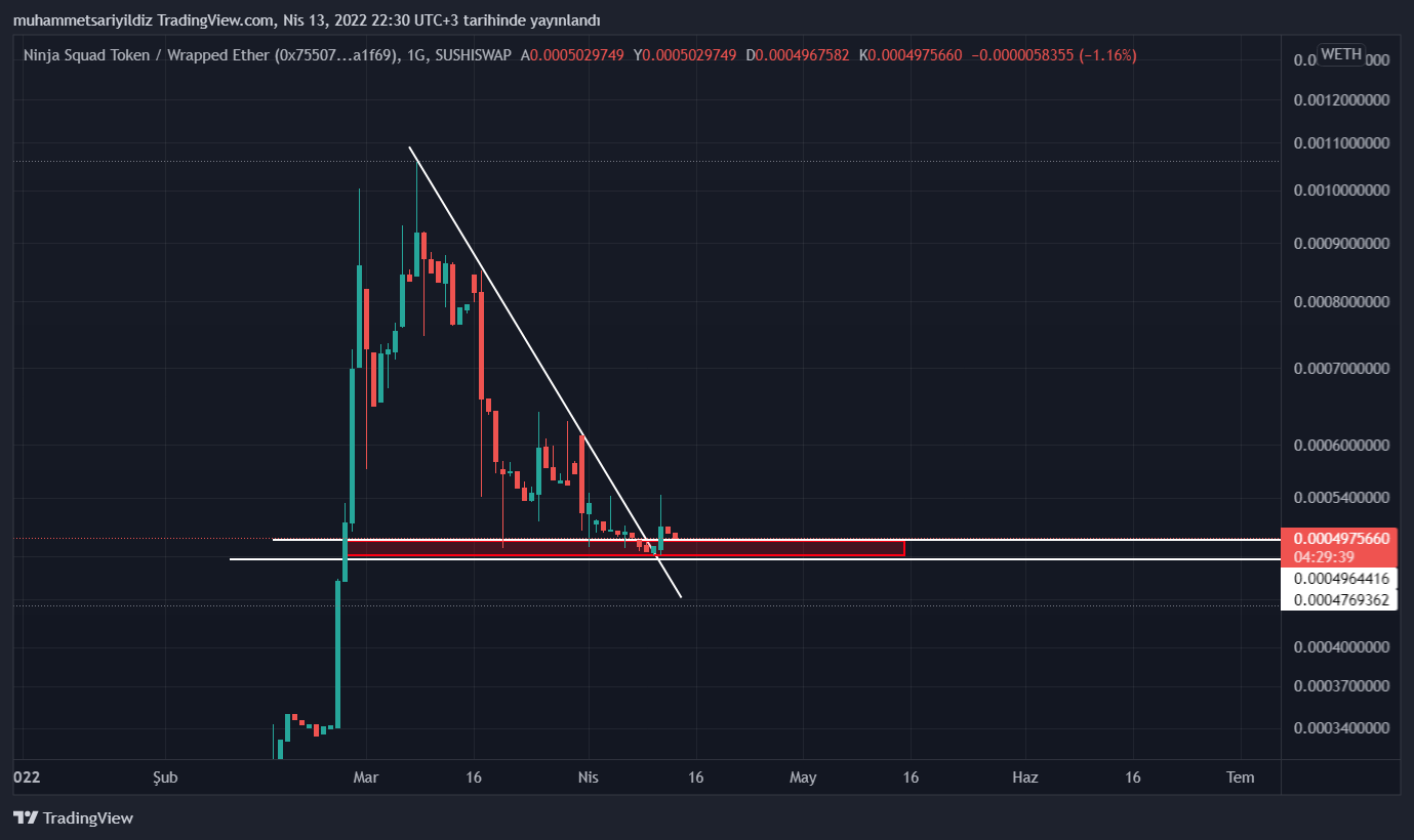 Geçtiğimiz günlerde düşen trendini kırmayı başaran Ninja Squad token, ilerleyen günlerde 0.0004950 – 0.0004750 Ethereum desteğini kaybetmediği takdirde, ApeCoin gibi yükselişe başlaması beklenmekte.