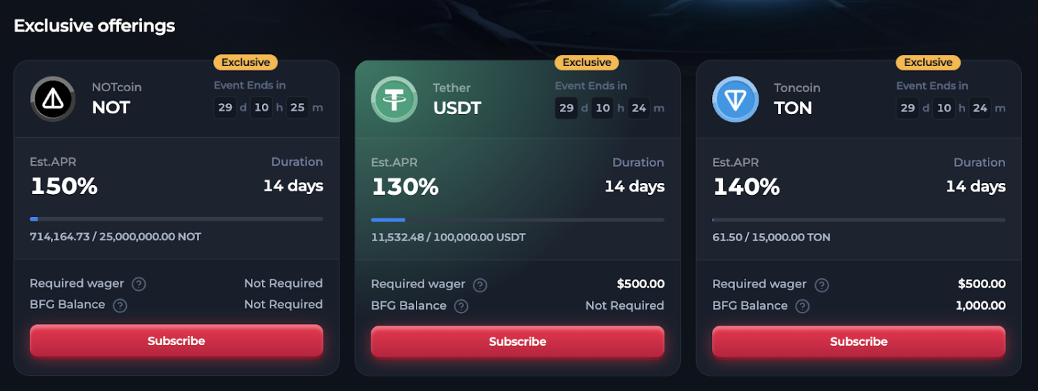 Notcoin Staking havuzunun yanı sıra, bu platform %140’a varan APR ile TON Staking ve %130’a varan APR ile USDT staking sunuyor. Dolayısıyla, bu faydalı teklif BetFury’de sadece 30 gün geçerli olduğundan, NOT ve diğer kripto para birimlerini kazanmak için harika bir şans.