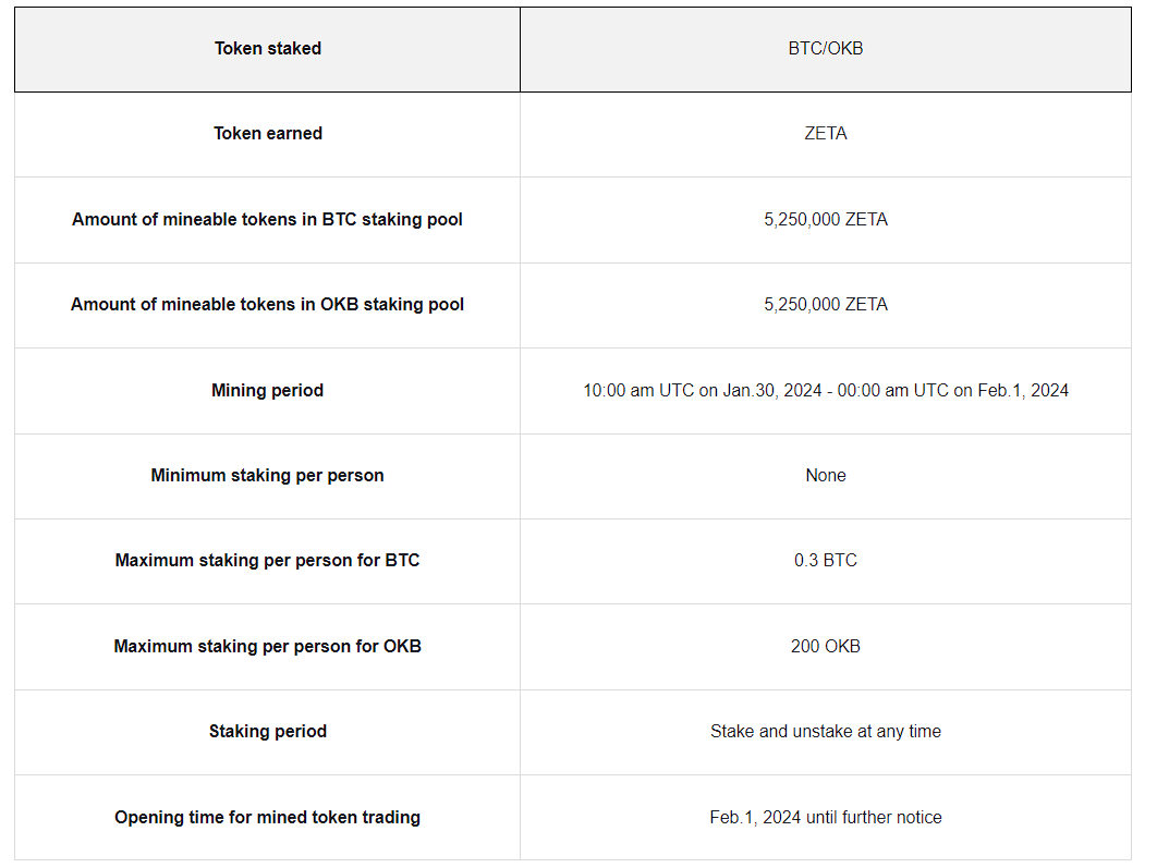 Kullanıcılar, 30 Ocak tarihinde ZetaChain (ZETA) kazanmak için BTC ve OKB’yi stake edebilecek; ZetaChain, Ağustos 2023’te 27 milyon ABD doları değerinde yatırım toplamıştı.