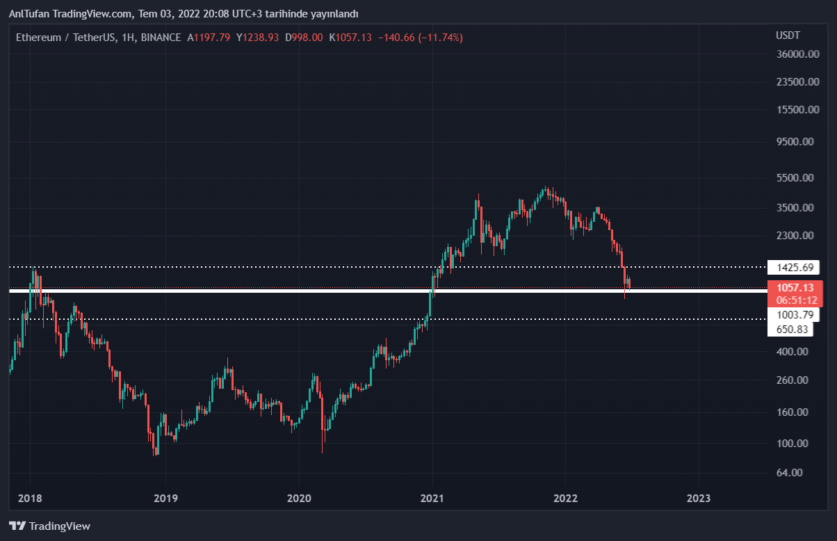 İlerleyen haftalarda 1000 dolar desteğini kaybetmesi halinde 650 dolar seviyelerine kadar yeni bir çöküş yaşayabilecek olan ETH, bu destek seviyesinde tutunması halinde ise 1425 dolar direncini hedeflemesi bekleniyor.