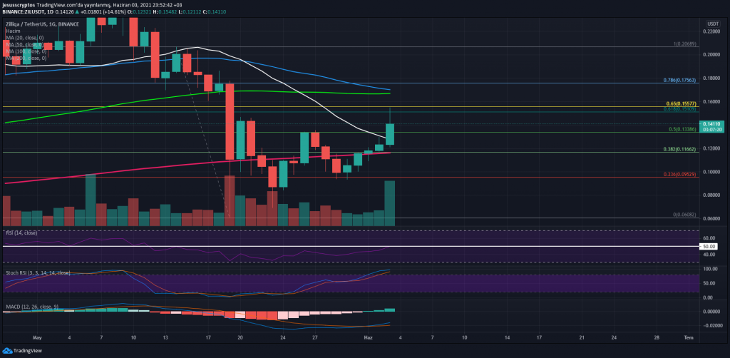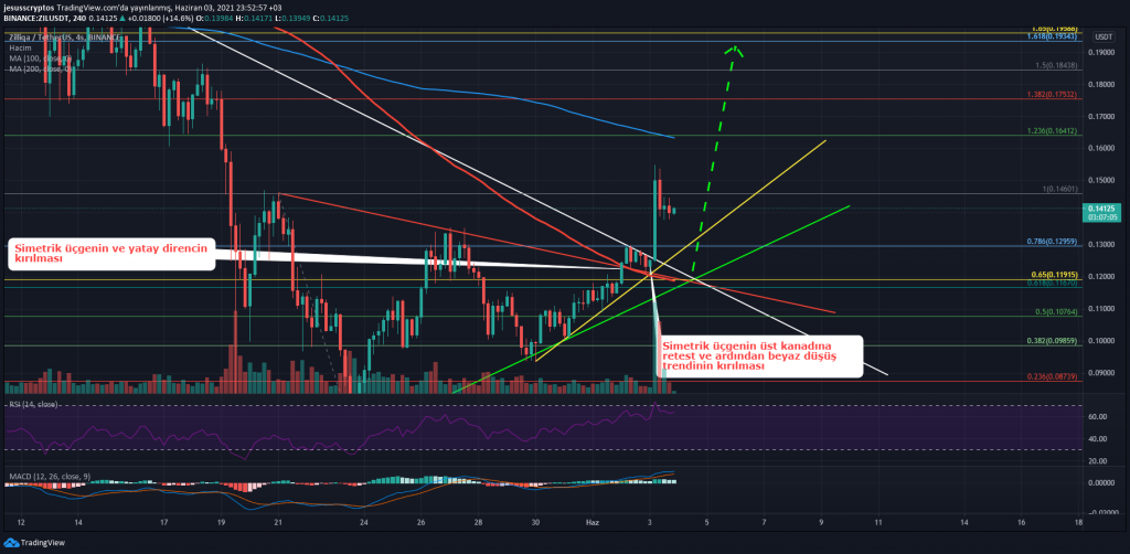 Ardından bu beyaz trend çizgisini de hacimli bir şekilde kıran ZIL, %25’lik bir yükselişin ardından kâr alımlarıyla birlikte geriliyor. Bu gerilemenin sarı trend çizgisi veya yeşil trend çizgisinde son bularak yükselmesi beklenirken ZIL’in ilk hedefi 0.164 dolar olarak izleniyor.