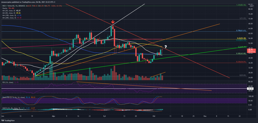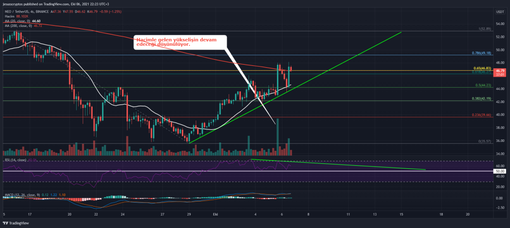 4 Saatlik grafik üzerinde 5 Ekim 19:00 mumunda hacimle gelen yükselişle NEO’nun MA200 seviyesi olan 46,72 dolar üzerine çıktığı ve ardından gelen kar satışlarıyla düşüşe geçtiği görülüyor.