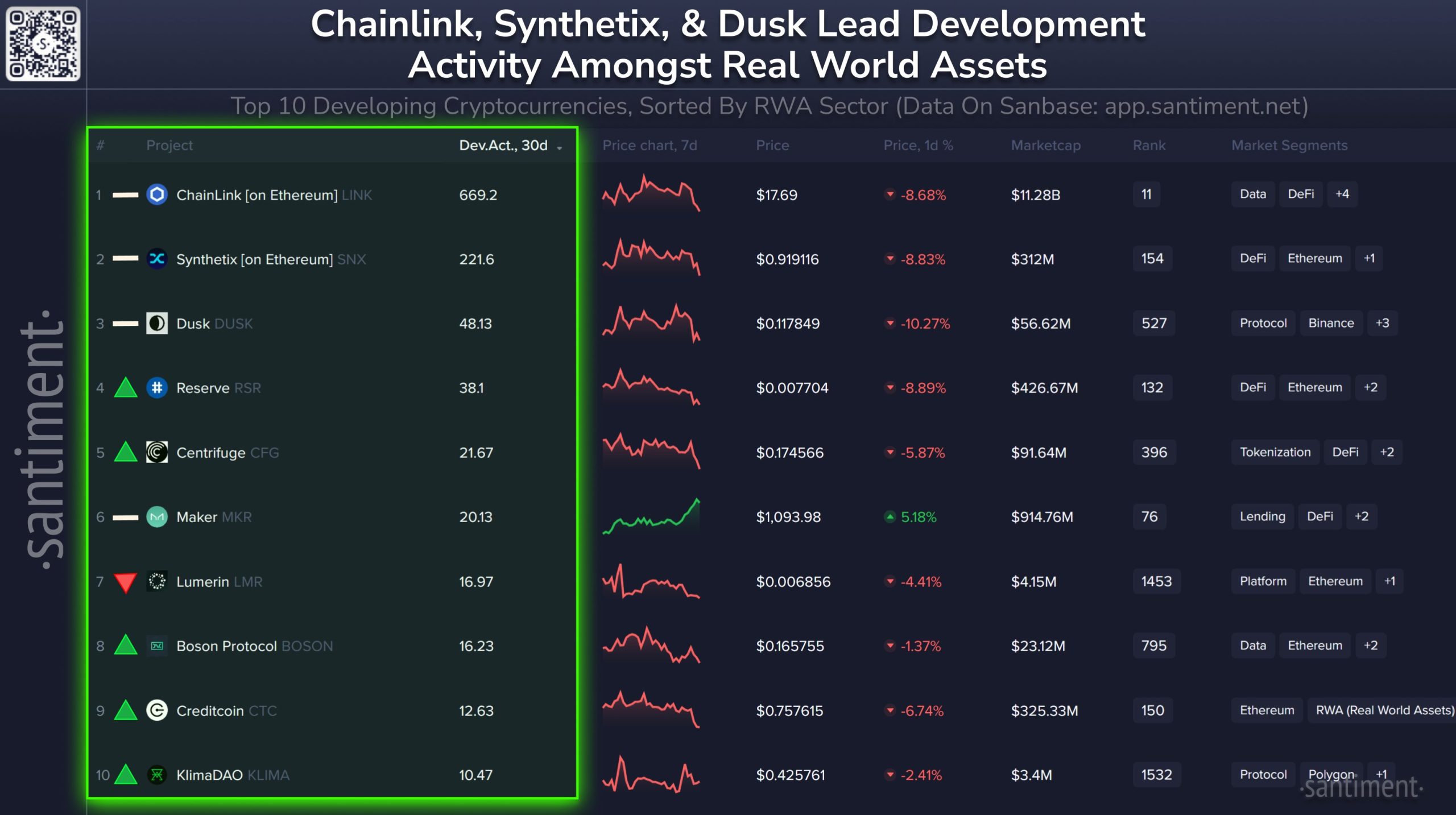 Başarılı bir analitik şirketi olan Santiment, kısa bir süre önce ise Gerçek Dünya Varlıkları (RWA‘lar) projeleri üzerinde bir araştırma yaptı. Uzmanlar bu araştırma doğrultusunda en çok geliştirilen 10 RWA altcoin‘ini tespit etti ve şu listeyi paylaştı: