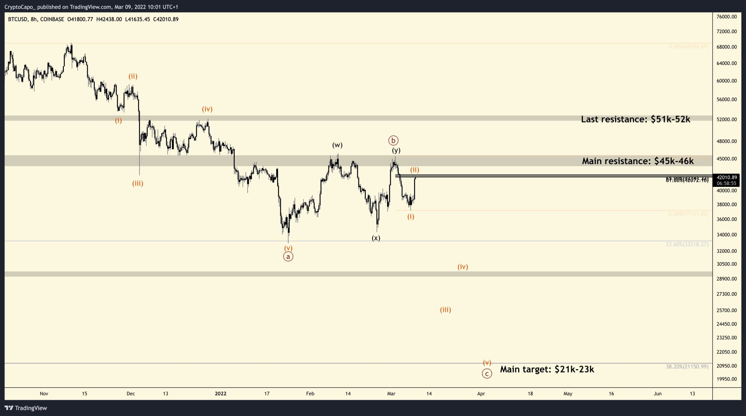 Cyrpto Capo, Bitcoin için yaklaşık 23.000 dolarlık hedefi, 2018 ayı piyasasının en düşük seviyesinden 2021 boğa piyasasının zirvesine kadar ölçüldüğünde %38.20 Fibonacci seviyesine denk geldiğini vurgulamakta.