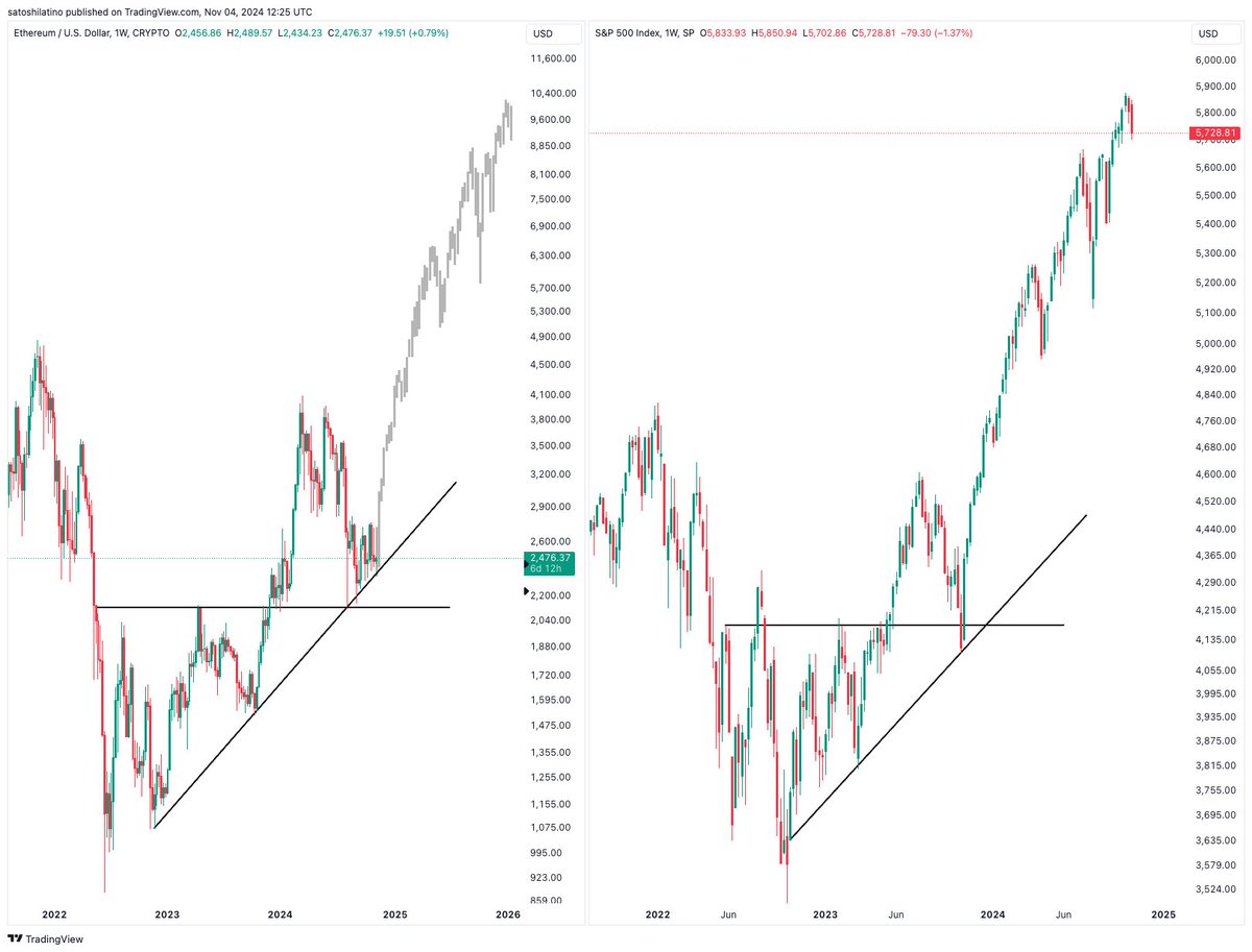 Kısa bir süre önce lider altcoin Ethereum‘u (ETH) inceleyen Martinez, ETH’nin önümüzdeki süreçte S&P500 gibi hareket etmesi durumunda dev sıçramalar yaşayabileceğini düşünüyor.