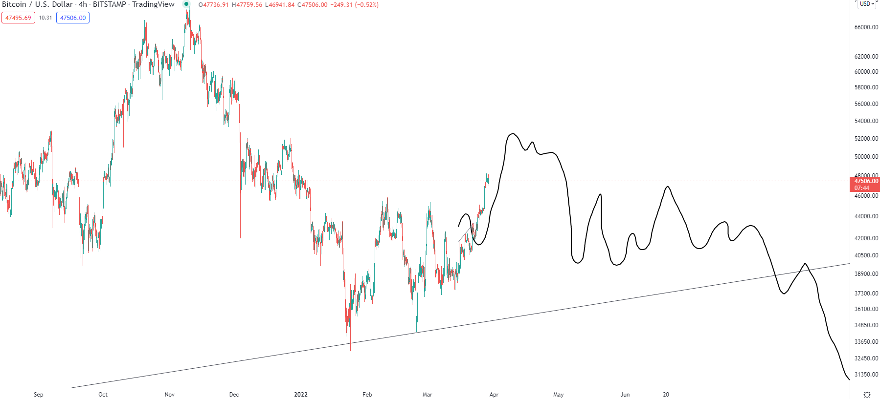 Kaleo buna rağmen olası bir düşüş için de senaryosunu paylaştı ve BTC’nin 50.000 doların üzerine çıkıp burada biraz kaldıktan sonra sert düşmesini bekliyor. Bu düşüşün yıllık trend çizgisinin de altına inmesini ve 31.000 dolara kadar sürmesini bekleyen analist, haklı çıkarsa piyasa ciddi anlamda kızıla boyanabilir.