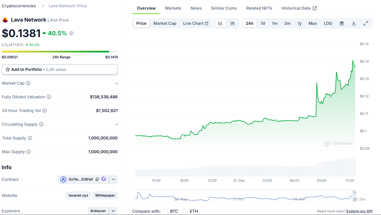 Bybit’in paylaştığı listeleme duyurusu ile birlikte LAVA fiyatında yükselişler meydana geldi. Kısa bir süre içerisinde %40’lık yükseliş yaşayarak 0.141 doları gören LAVA, an itibariyle ise 0.138 dolardan işlem işlem görüyor.