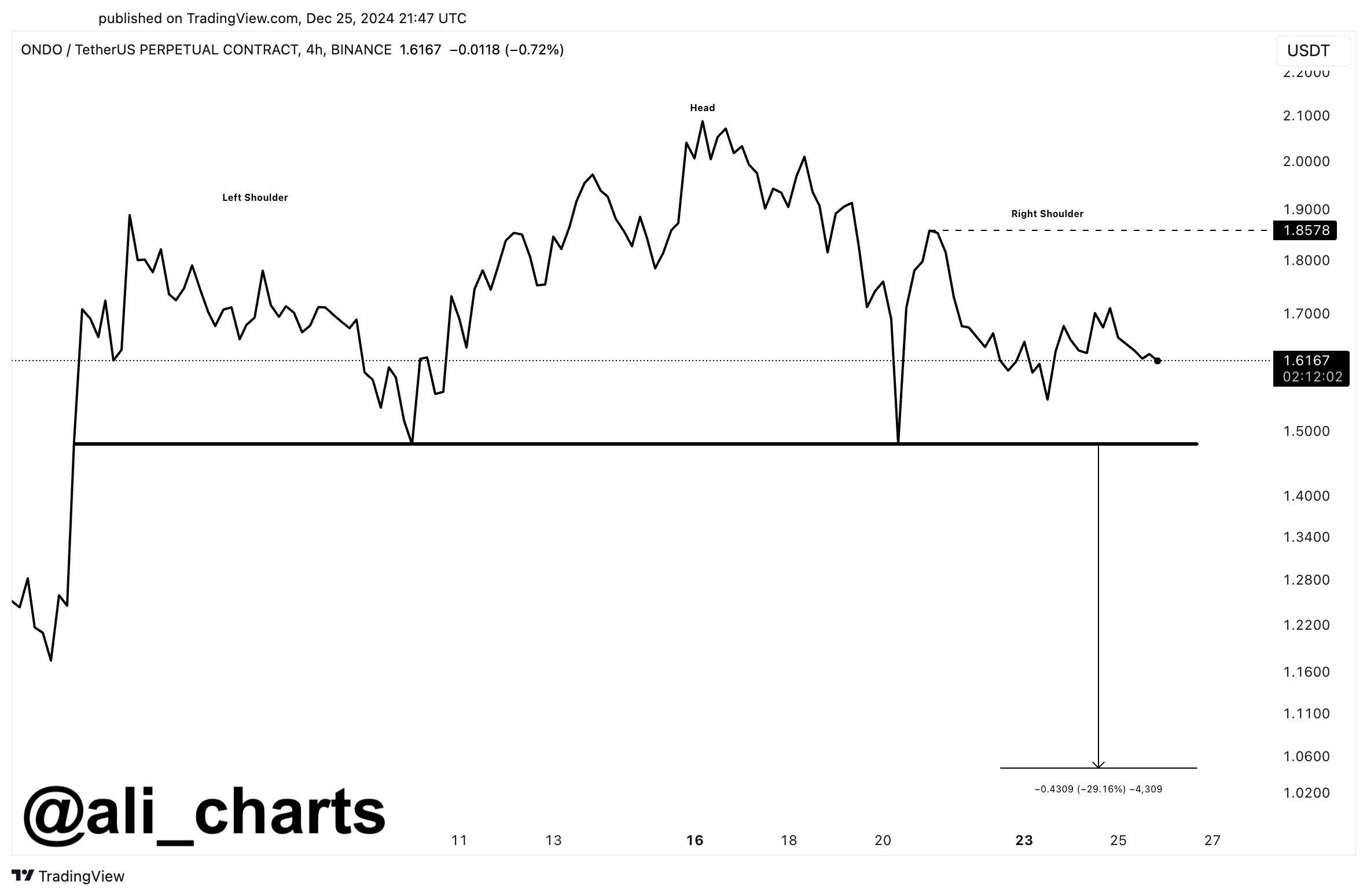Bu 2 altcoin’in de bir ayı formasyonu olan Omuz Baş Omuz (OBO) oluşturduğunu düşünen Martinez, 2 altcoin’in fiyatının da -%30’luk düşüşler yaşayacağına inanmakta. Ali Martinez LINK ve hakkında ONDO hakkında şu sözleri aktardı: