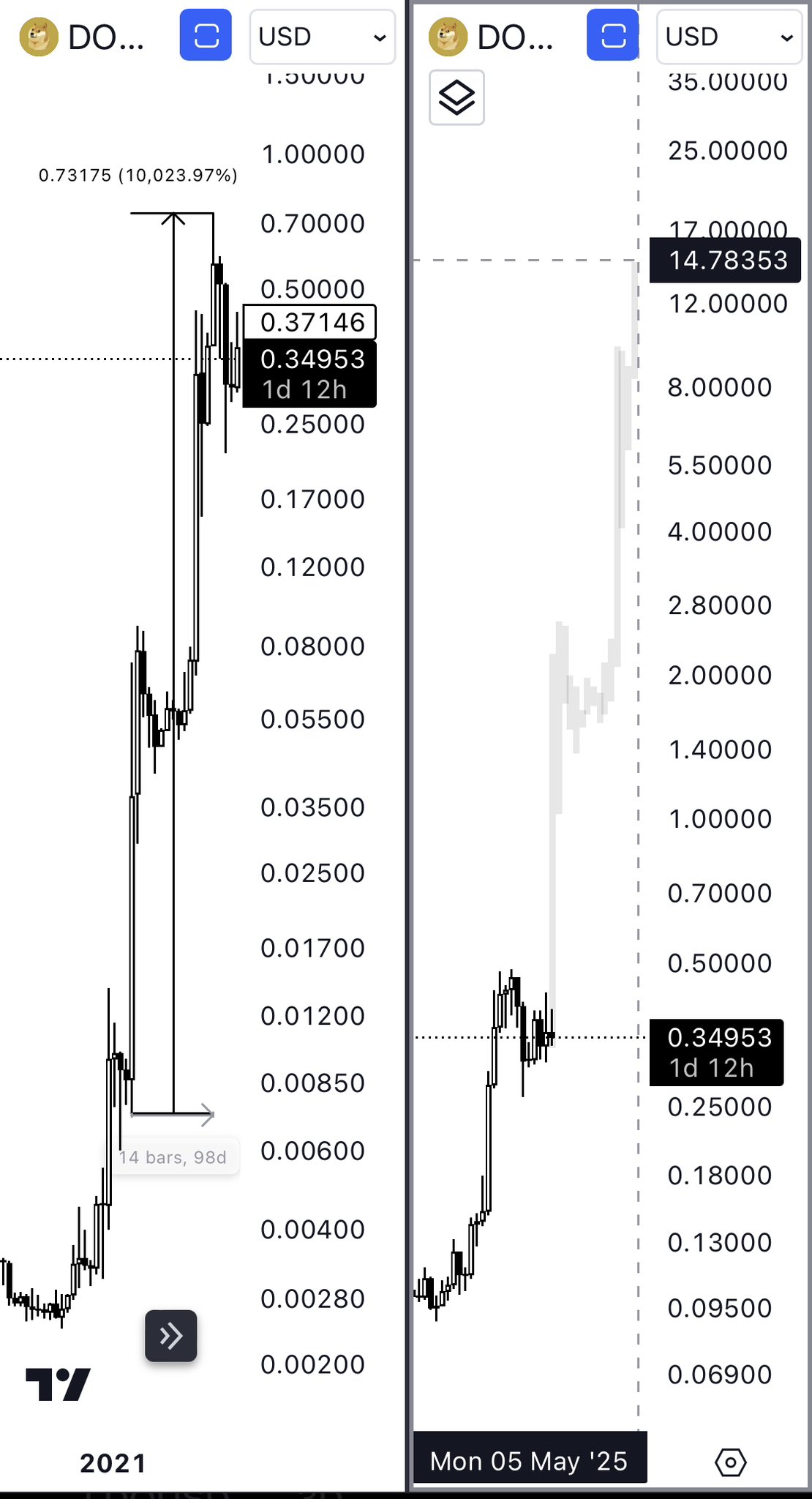 Martinez “2021 boğa döngüsü boyunca Dogecoin (DOGE) sadece 98 günde %10.000’in üzerinde fırladı” dedi. Popüler analist DOGE’nin boğa sezonu sonunda 14.78 dolara ulaşmasını bekliyor.