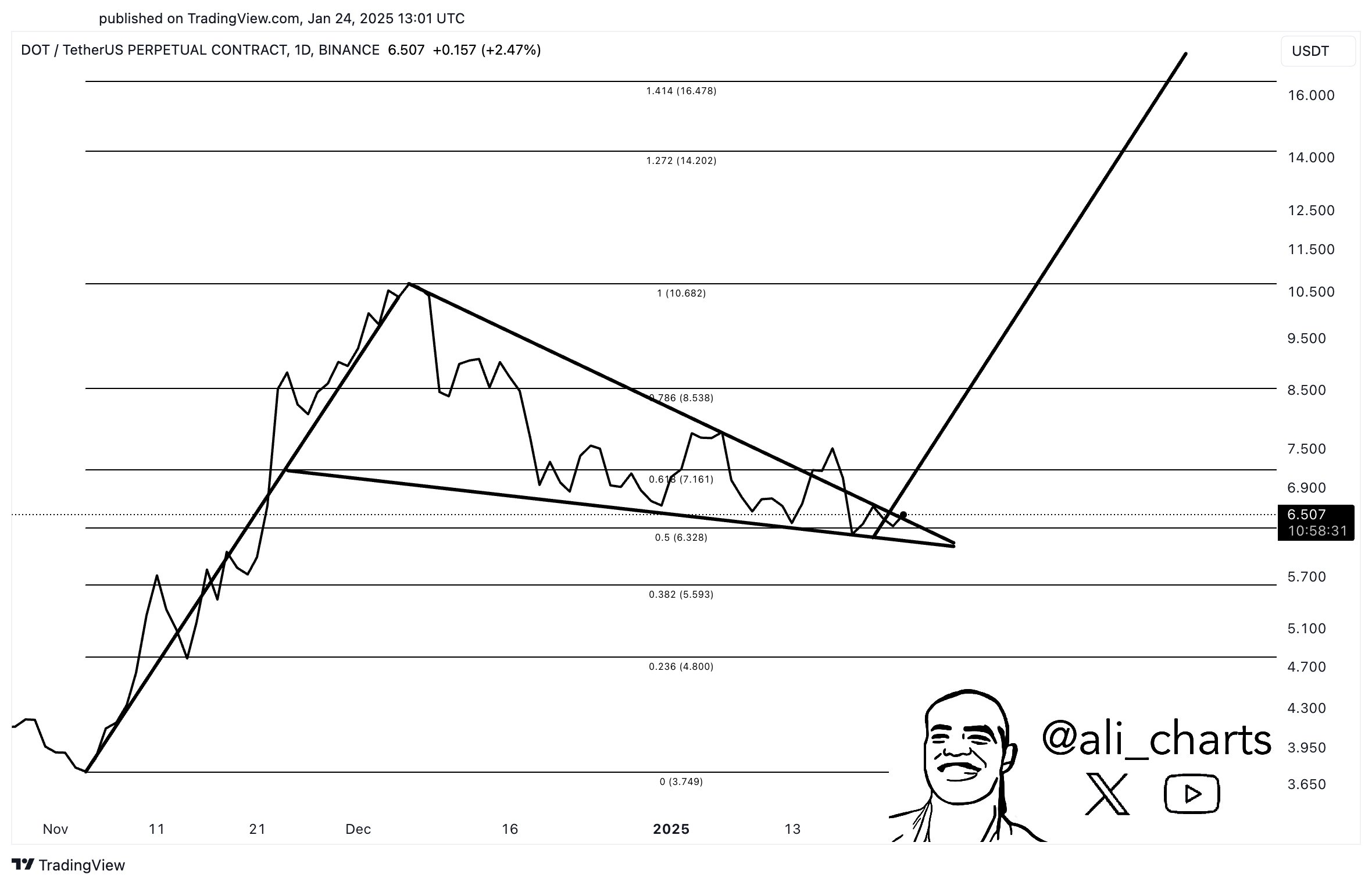 Başarılı analist “Polkadot (DOT) boğa flamasından çıkmaya hazır görünüyor” dedi. Martinez DOT’un boğa sezonu sonunda 17 dolara ulaşmasını bekliyor.