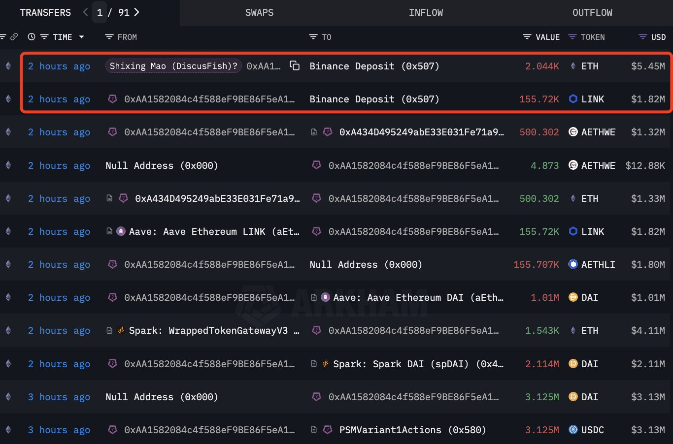 Discus Fish ile ilgili bir cüzdan 2 saat önce Binance’e satış yapmak için toplamda 2.044 adet ETH (5,45 milyon dolar değerinde) ve 155.720 adet LINK (1,85 milyon dolar değerinde) yatırdı.