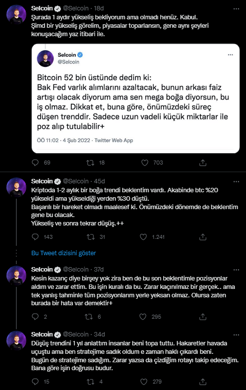 Selcoin yanılmış olsa dahi, yükseliş beklentisinden vazgeçmedi. Halen yeni bir boğa trendinin başlayacağına inanan kripto fenomeni, yaz sonu ise Bitcoin‘in düşüş yaşayacağından emin gibi gözükmekte.