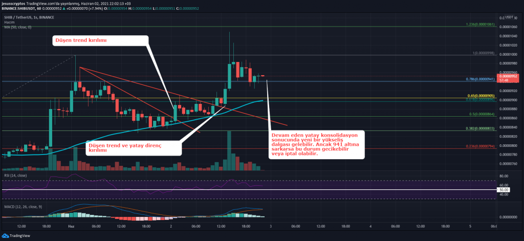 İlk yükseliş hareketinin ardından kademeli olarak MA50 seviyesi olan 0.00000897 dolara kadar gerileyen SHIB’in buradaki ilk düşüş trendini kırdıktan sonra ikinci düşüş trendini ve aynı zamanda yatay direnci kırdığı görülüyor.