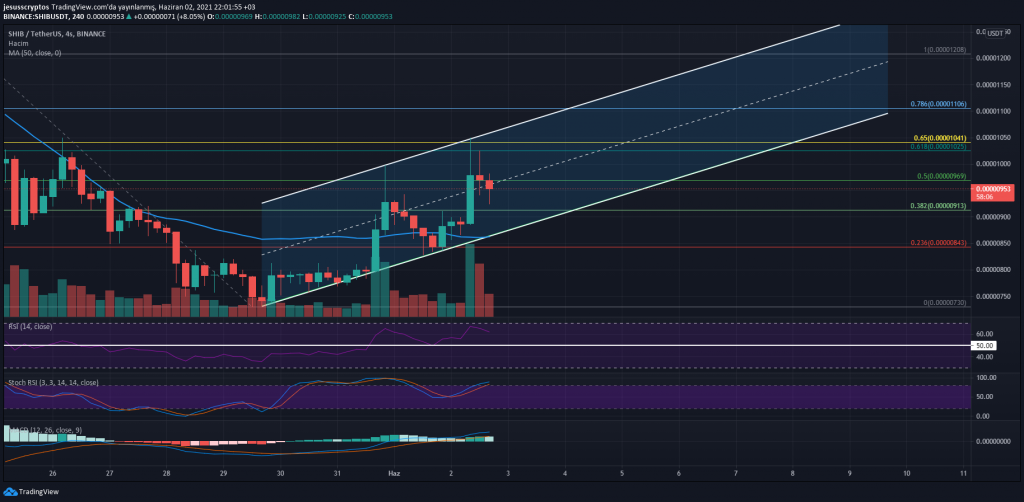Günlük grafikte Binance’te yeni bir coin olması ve yaşanan düşüş nedeniyle henüz olgunlaşmadığı düşünülen SHIB’i 4 saatlikte değerlendirdiğimizde, yükselen kanal görünümünün mevcut olduğu görülüyor. Bu kanalın orta bandında tutunmaya çalışan SHIB’de satış baskısının artması halinde fiyatın daha önce kırdığı MA50 seviyesi olan 0.00000863 dolara kadar çekilmesi beklenebilir.