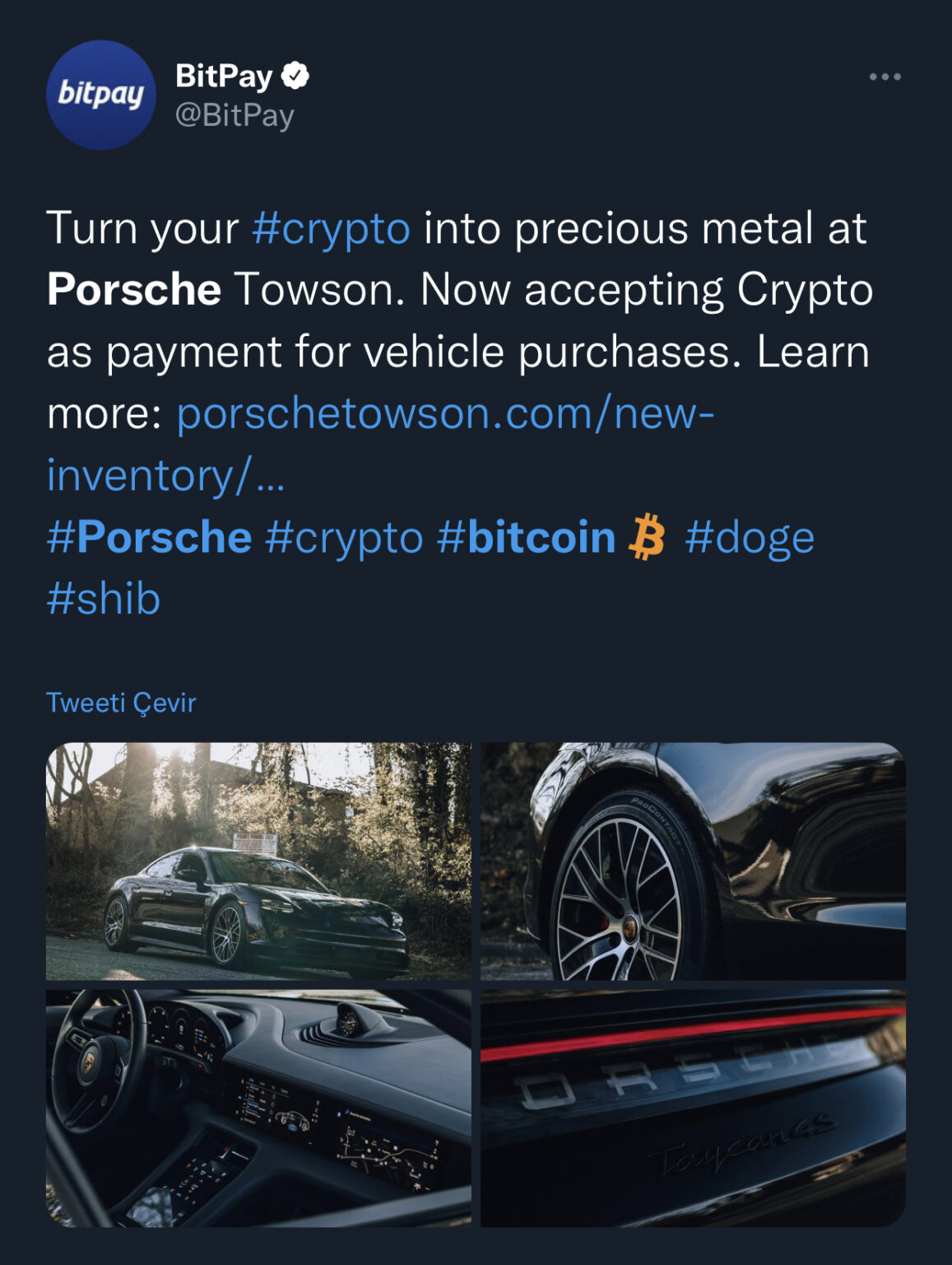 ABD’nin Towson eyaletindeki Porsche bayisi yaptığı bu yeniliği duyurmasıyla birlikte kripto piyasasının gündemine otururken, Bitpay’ın da yapmış olduğu ortaklıkların sayısı günden güne artış göstermekte.
