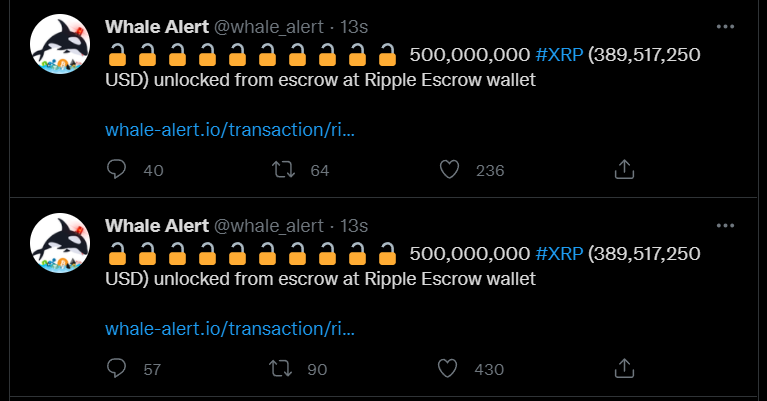 WhaleAlert’in paylaştığı bilgilere göre bu sabah itibariyle 2 kademeli olarak Ripple, 1 milyar XRP’nin kilidini açarak piyasaya sürdü. Bu kilit açılımlarının hepsinin ise dolaşımdaki arza eklenmesi beklenmiyor.