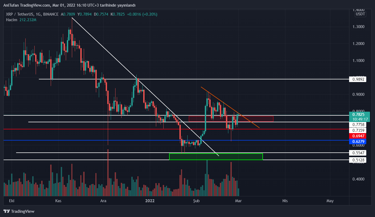 Bu trendin kırılması için 0.80 dolar seviyesi üzerinde günlük kapanış yapması gereken XRP, bu kırılım ardından daha üst seviyeleri hedefleyebilir.
