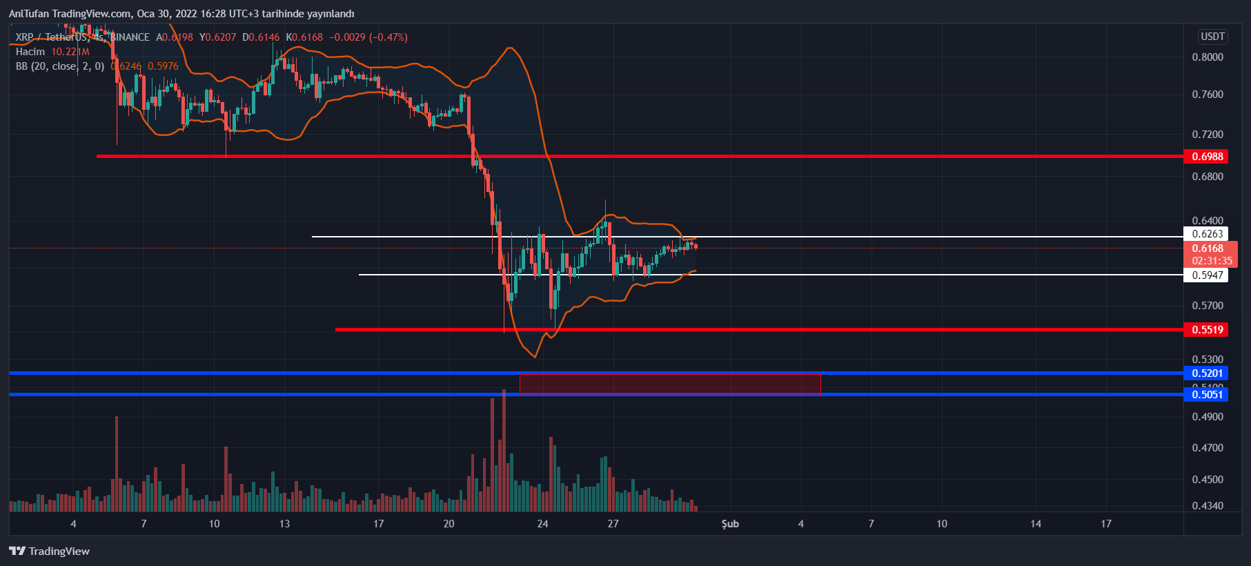 Bolinger bantları gibi XRP fiyatı da 0.6250 – 0.6000 dolar aralığına sıkışmış durumda. XRP yukarı yönlü bir patlama yapması durumunda, 0.6988 dolar seviyelerine yükselebileceği gibi aşağı doğru bir kırılım gerçekleştirmesi halinde 0.5500 dolar seviyelerine geri çekilme yaşayabilir.