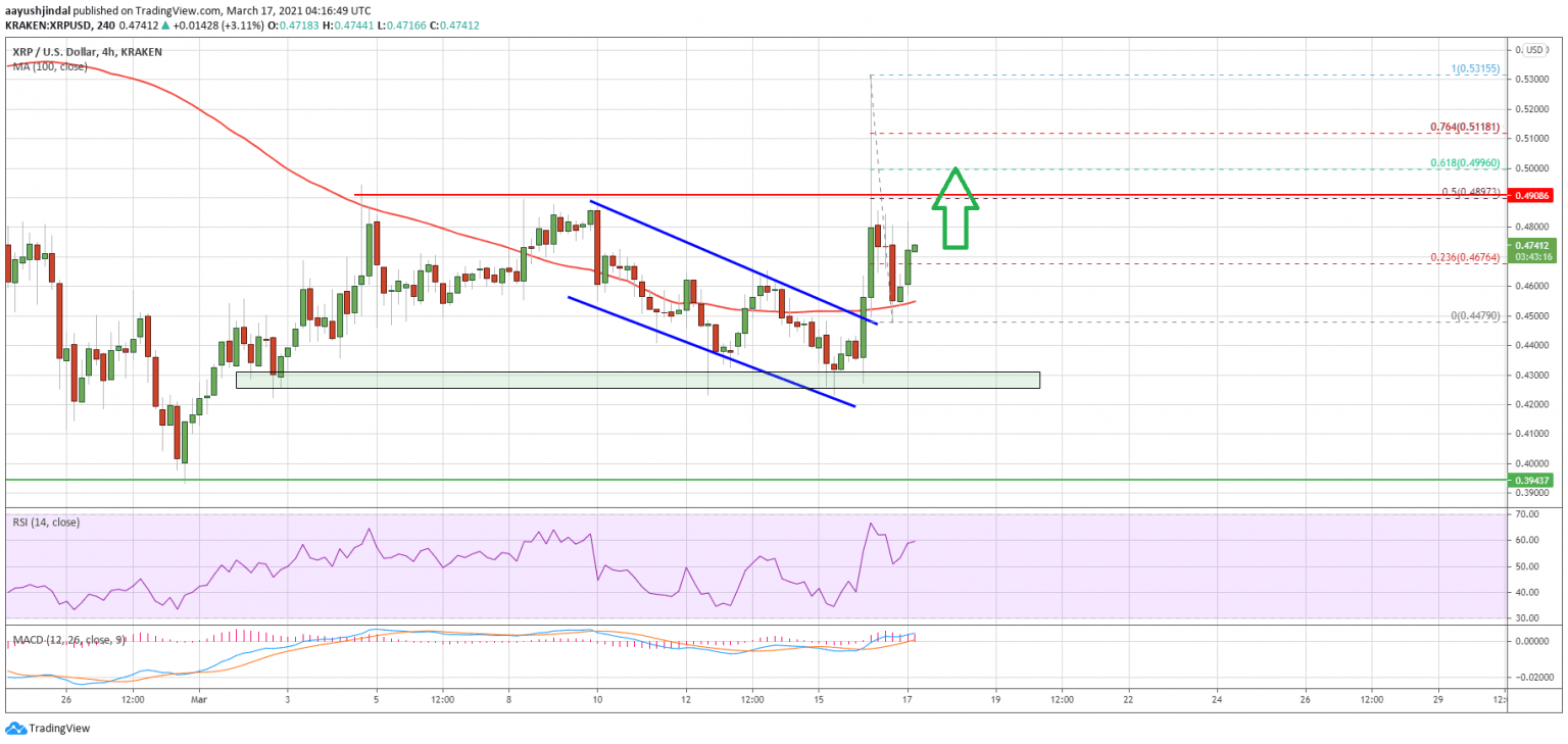 XRP/USD teknik analizine bakıldığında, 0,48 dolar direncinin kırılmasından sonra fiyatın kademeli olarak 0,55 dolara kadar yükselebileceği görülüyor.