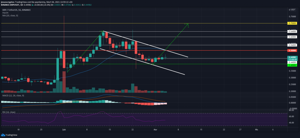 XRP’nin bu formasyon içerisinden çıkıp üst trend çizgisini kırması ve 0.50 dolarlık direnç seviyesini geçmesi halinde söz konusu formasyon hedefi olan 0.70 dolara bir yükseliş görülebilir. Bu yükseliş sırasında ise fiyatın ara direnç seviyelerinde dinlendiği görülebilir ve hatta geri çekilmelerde alış yapılabilir. Yatırımcılar, bu geri çekilmelerde 0.50 dolara stop koymayı tercih edebilirler.