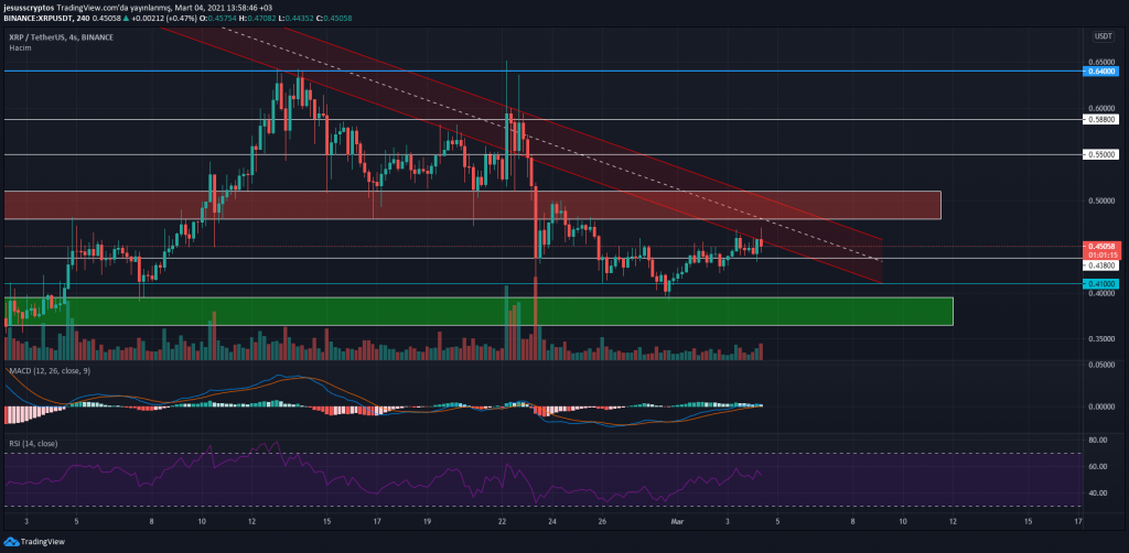 4 Saatlik grafiğimizde bu düşüş trendi direnç alanının kırılması halinde XRP’yi 0.48 – 0.51 dolar aralığındaki kırmızı yatay direnç alanı bekliyor. Bu alanın aşılması halinde XRP fiyatında kademeli olarak 0.64 dolara kadar yükseliş görülebilir.