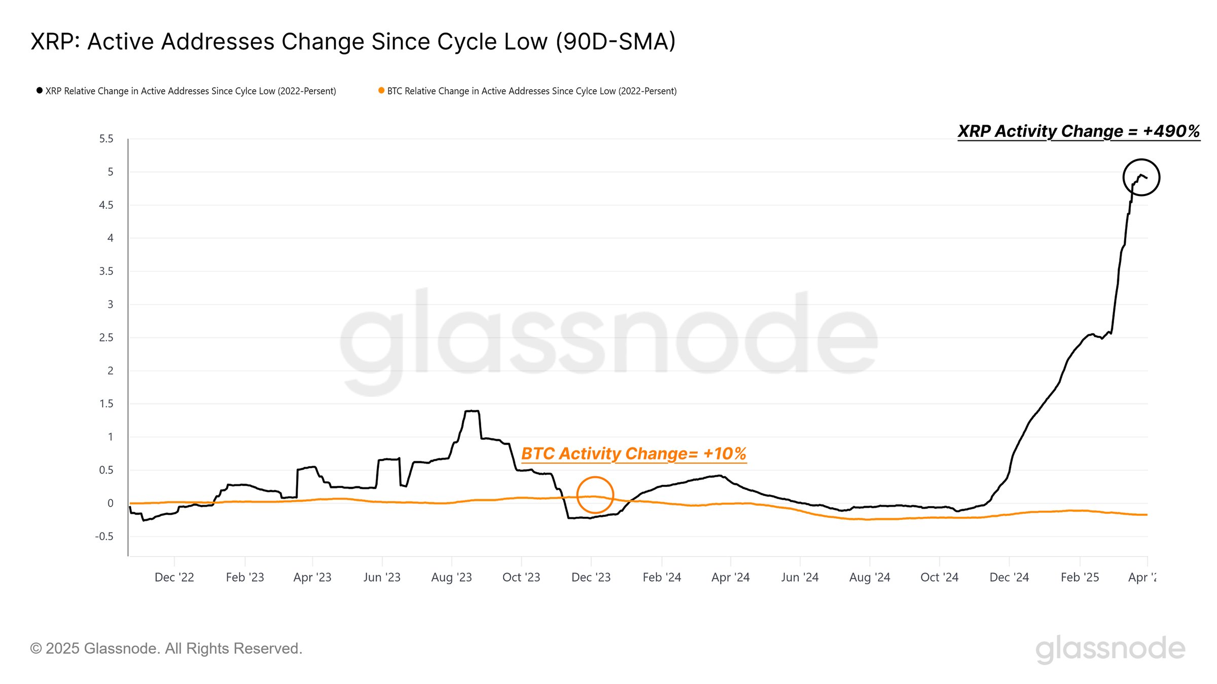 - 2022 döngü dip seviyesinden bu yana, XRP aktif adresleri %490 artış gösterirken, BTC yalnızca %10’luk bir artış gördü. Bu verilerde spekülatif perakende talebinin arttığını kanıtlıyor.