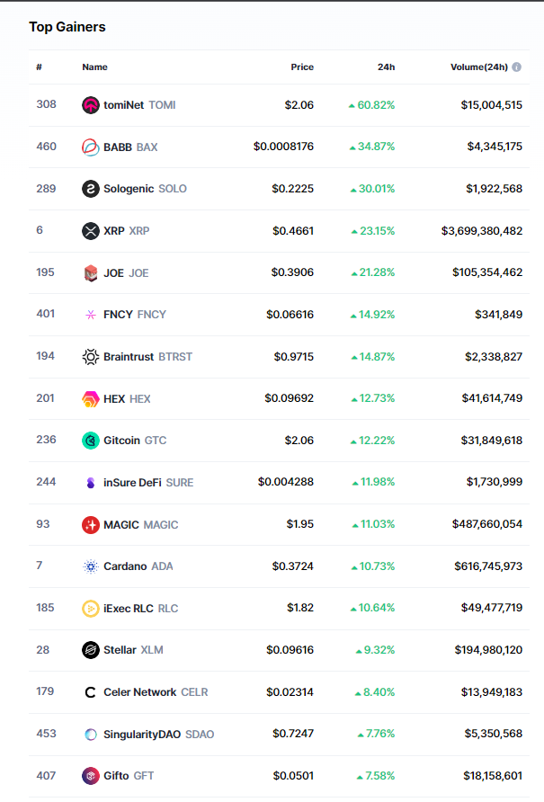 Bugün yükseliş yaşayan ürünlere baktığımızda ise TOMI isimli altcoin’in ilk sırada olduğu görülüyor. TOMI’nin ardından ise SOLO, BAX, XRP, JOE, BTRTS, FNCY ve ADA geliyor.