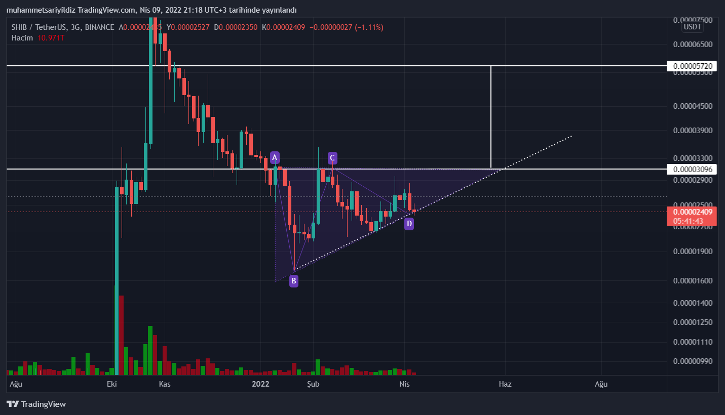 Yükselen üçgen formasyonunun alt desteğinin hemen üzerinde konumlanan SHIB, bu gece yapacağı 3 günlük kapanışı kati suretle 0.00002400 doların üzerinde gerçekleştirmesi gerek.