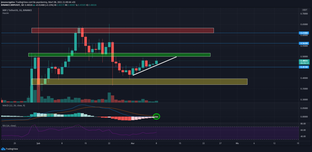 Bu yükselen üçgeninin yukarı kırılması ve bu kırılımın 0.50 – 0.516 dolar aralığının aşılmasıyla olacağı düşünülüyor. Özellikle 0.50 dolar üzerinde günlük mum kapanışlarının gelmesi, bu yükseliş beklentisini güçlendirecektir. Bu durumu destekleyen bir diğer pozitif işaret ise MACD göstergesindeki kırmızı histogramın küçülmesi ve AL sinyaline yaklaşması olarak gösteriliyor.