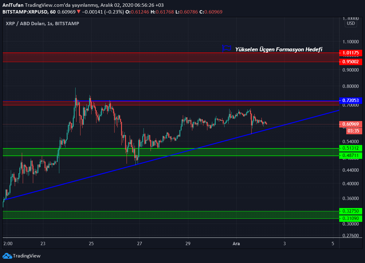 0.72 kritik bir direnç haline dönüşen XRP için bu seviyenin kırılımı tekrar bir boğa momentumu oluşturacağı için ve yükselen üçgen formasyonu dolayısıyla 0.95-1 dolar ana direncimize kadar bir yükseliş bekleniyor.