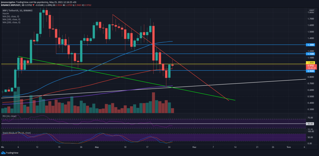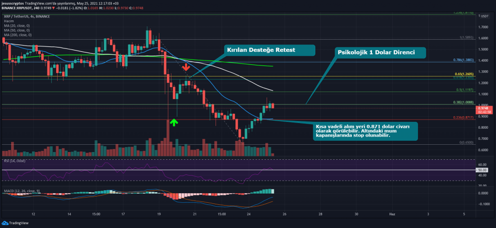 19 Mayıs günü yaşadığı %48’lik düşüşle yatırımcıları şoka uğratan XRP, devam eden günlerde bu düşü daha da derinleştirerek 200 günlük hareketli ortalama olan 0.65 dolara kadar geriledi. 23 Mayıs itibariyle bu dip seviyesini gören XRP, son 24 saatte %30’un üzerinde değer kazanarak yayın saati itibariyle 0.974 dolar üzerinden alıcı buluyor.