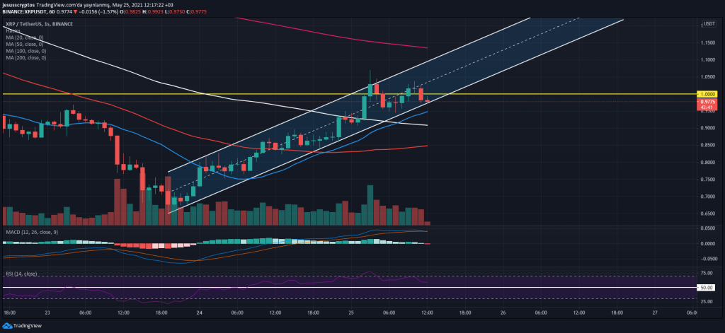 Kısa vadede 0.65 dolarlık dip seviyesini gören ve şimdilerle 1 doları zorlayan XRP, saatlik grafikte yükselen kanal görünümü içinde bulunuyor.