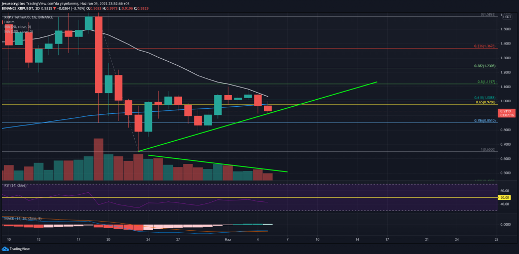 Bahsi geçen analizde belirtilen yükselen üçgenin üst bandında bulunan kırmızı düşüş trendinden ciddi bir satış baskısı yiyen XRP, ilk etapta formasyonun alt bandında destek almışa benziyor.