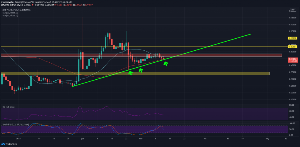 Yeşil çizgi ile gösterilen bu trendin XRP tarafından birkaç defa denendiği ve fiyatın bu trendden destek bulduğu ortaya çıkıyor. Yatay direnç alanı olan 0.465 – 0.485 dolar aralığının bir hafta boyunca denediği ancak kırılamadığı ve fiyatın bu yüzden son iki gündür destek çizgisini denediği görülüyor. Bu trendin kırılması yani en azından altında iki günlük mum kapanışı veya derin bir mum kapanışıyla yatırımcıların stop olması doğru olabilir.